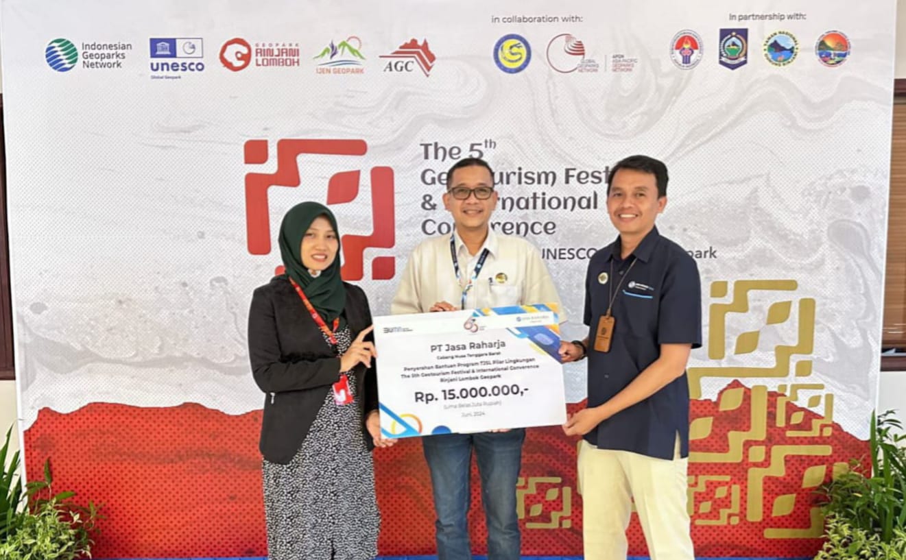 Nusrasuara.com – Jasa Raharja menyalurkan bantuan TJSL Pilar Lingkungan dalam acara The 5th Geotourism Festival & International Converence. Dukungan itu diberikan dengan memberikan support dana sebesar Rp15.000.000.