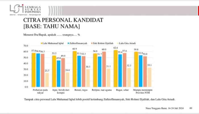 Terakhir, dengan posisi citra personal teratas LMI dinilai mampu memimpin provinsi NTB dengan poin 59,8, disusul Zulkieflimansyah 53,9, kemudian Rohmi 52, dan terakhir Lalu Gita dengan 33,1.