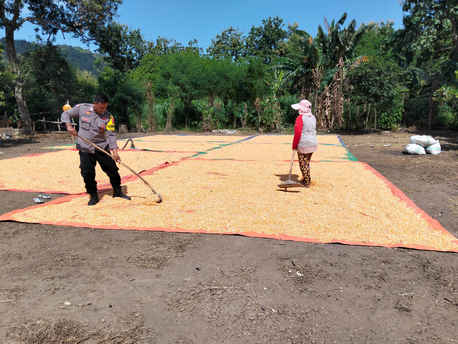 Dalam pelaksanaan kegiatan, Bhabinkamtibmas melakukan pemantauan terhadap proses penjemuran hasil panen jagung serta berdialog langsung dengan petani guna mengetahui kondisi di lapangan sekaligus memberikan motivasi.