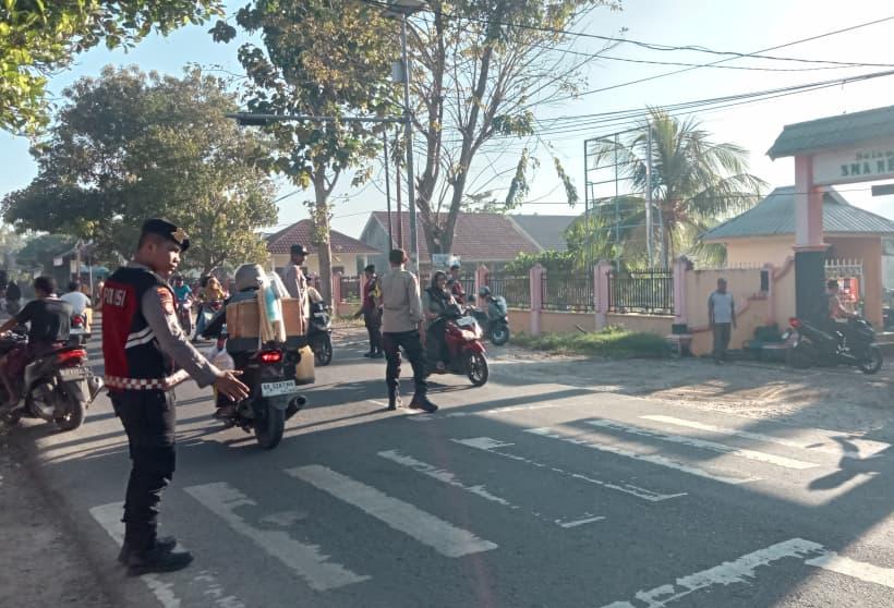 Kehadiran personel kepolisian di lokasi sekolah merupakan langkah preventif untuk mencegah terjadinya kecelakaan lalu lintas, mengingat tingginya aktivitas kendaraan pada pagi dan siang hari.