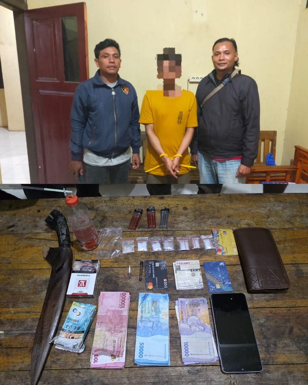 Tepat pukul Pukul 19.00 WITA, Tim melakukan penangkapan terhadap terduga pelaku dan melakukan penggeledahan badan sehingga didapatkan 1 Bungkus Rokok Sampoerna dan 1 Bungkus Rokok Esse yang didalamnya terdapat 1 plastik diduga kuat narkoba jenis Shabu siap edar.