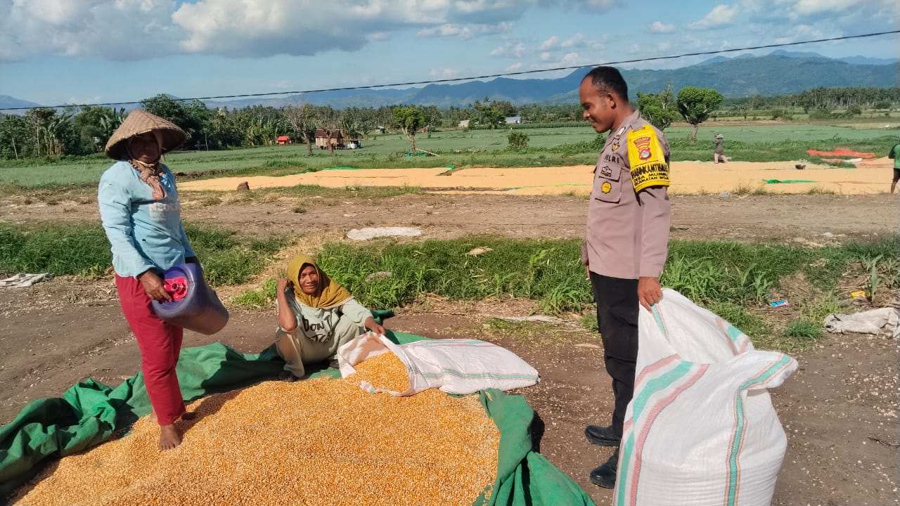 Dalam pelaksanaan kegiatan, Bhabinkamtibmas melakukan pemantauan terhadap hasil panen jagung milik warga binaan atas nama Ibu Fatimah (45 tahun) yang sedang dalam proses penjemuran. Jagung tersebut ditanam di lahan seluas ±2 hektar dengan varietas hibrida merk NK 7328, yang telah memasuki usia panen sekitar 120 hari dan dipanen pada bulan Maret 2026, dengan estimasi hasil panen mencapai ±11 ton jagung pipilan kering (JPK).